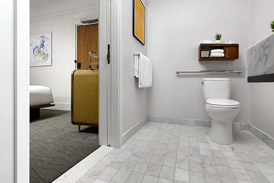 This accessible room features bluetooth speakers, an in room pantry, and an private bathroom with free toiletries and bathrobes.